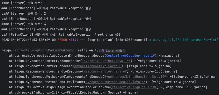 이런 경우엔 ErrorDecoder를 커스터마이징해서 특정 상태 코드에서만 RetryableException을 직접 throw 해야 한다.