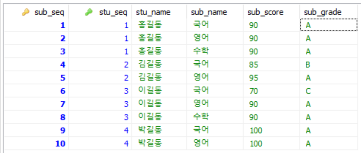 SUBJECT 테이블에는 분리된 문자열만큼 각 데이터가 INSERT된 걸 확인할 수 있다.
