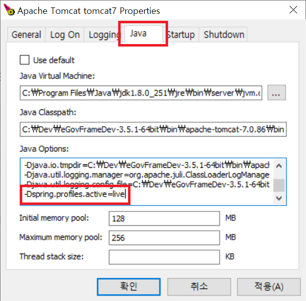 b. [Java] 탭 Java Options 마지막 줄에-Dspring.profiles.active=[데이터베이스 구분자] 입력 후 저장