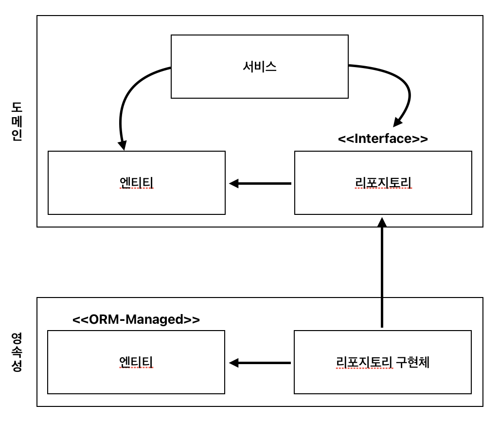 그러나 영속성 계층의 리포지토리가 도메인 계층에 있는 엔티티에 의존하게 되기 때문에 두 계층 사이에 순환 의존성(circular dependency)이 생긴다.