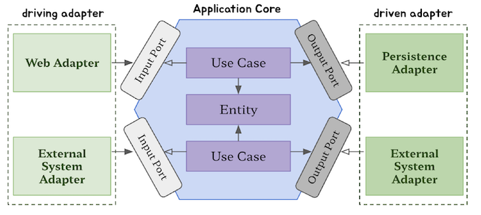 육각형 외부로 향하는 의존성이 없기 때문에 마틴이 클린 아키텍처에서 제시한 의존성 규칙이 그대로 적용된다.