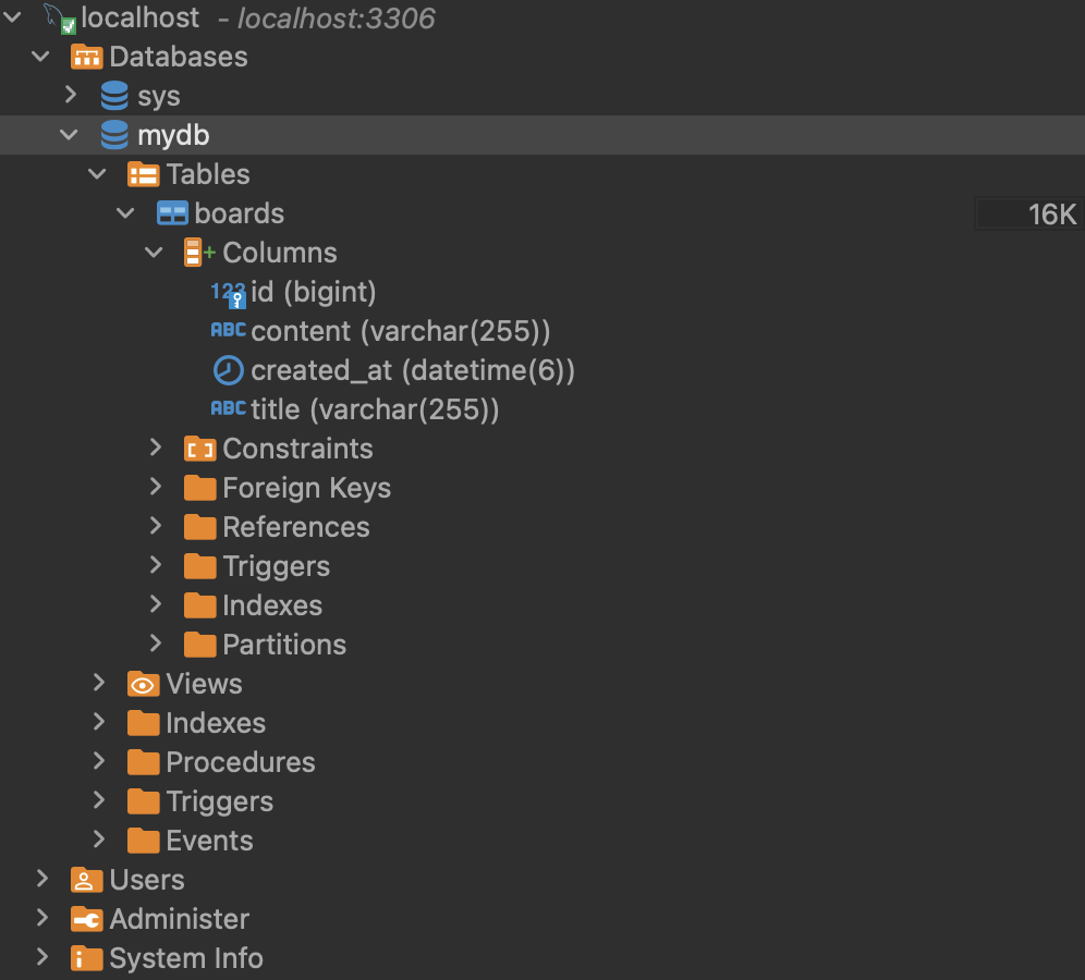 기존 application.yml 파일에 mydb 데이터베이스를 사용하는 것으로 연동 정보를 작성하였기에, 로컬 데이터베이스에 접속하여 mydb 데이터베이스를 생성해준다.
