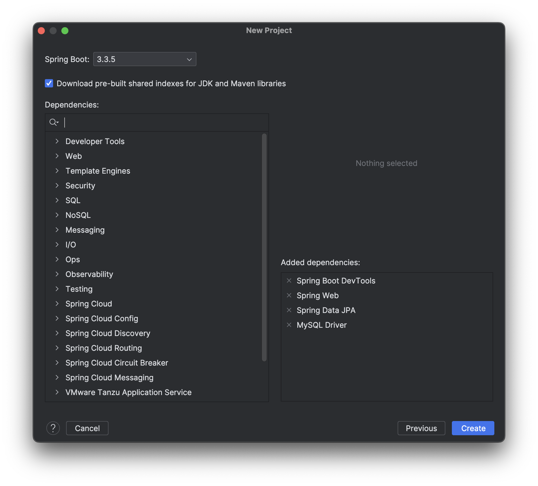 총 4개의 디펜던시를 선택하고 프로젝트를 생성한다.