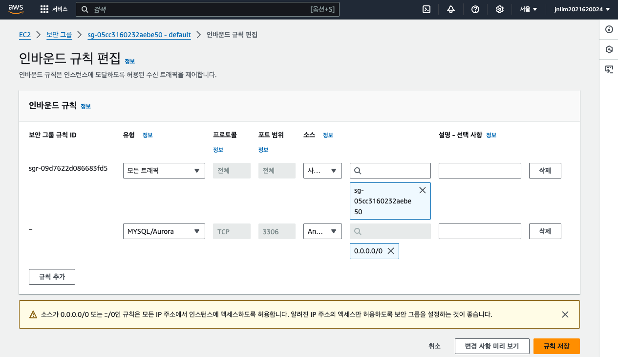 규칙 추가를 클릭하고 유형을 MYSQL/Aurora를 선택하고 소스는 Anywhere-IPv4를 선택한 후 규칙 저장을 한다.