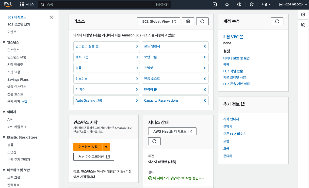 AWS 홈페이지에 로그인한 후, EC2를 검색해서 클릭한다.