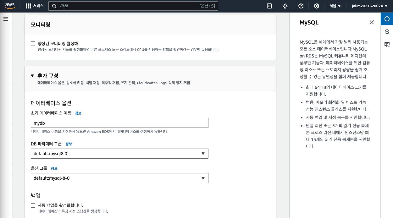 모니터링 밑에 있는 추가 구성 부분에 초기 데이터베이스 이름을 작성하고,
