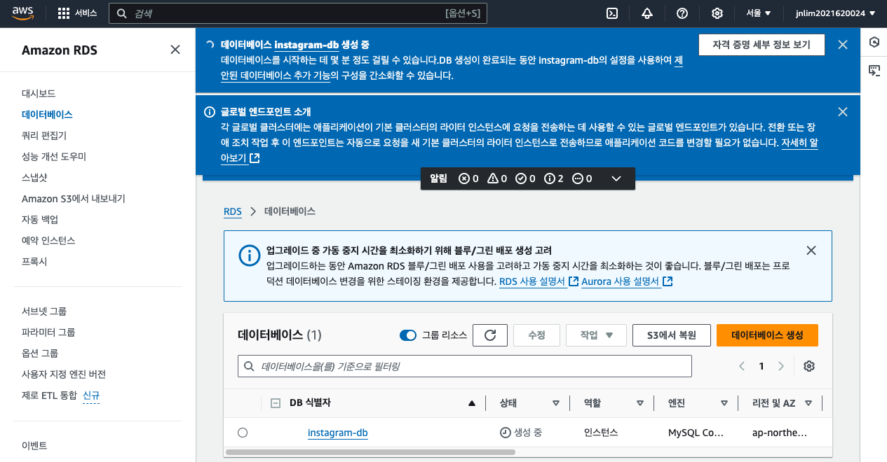 이제 RDS 세팅도 끝났으니 데이터베이스 생성을 해보자!