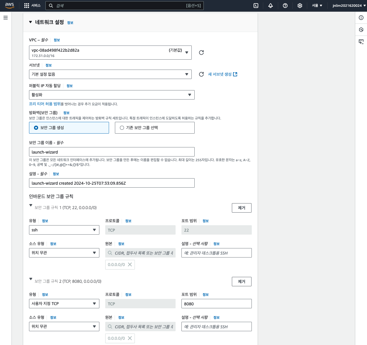 네트워크 설정은 그대로 유지하고 Spring Boot와 통신하기 위한 보안 그룹 규칙 하나를 추가한다.