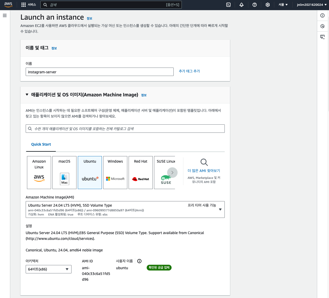 리전이 서울인 것을 확인하고 인스턴스 시작을 클릭한다.