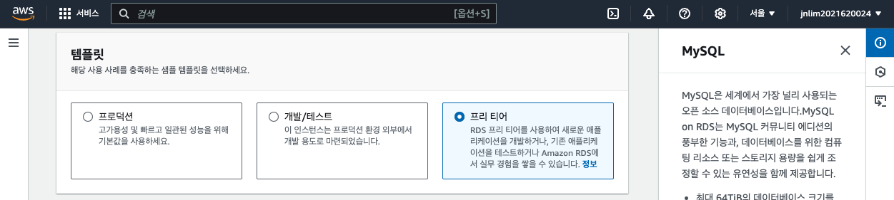 템플릿은 프리 티어를 선택한다.
