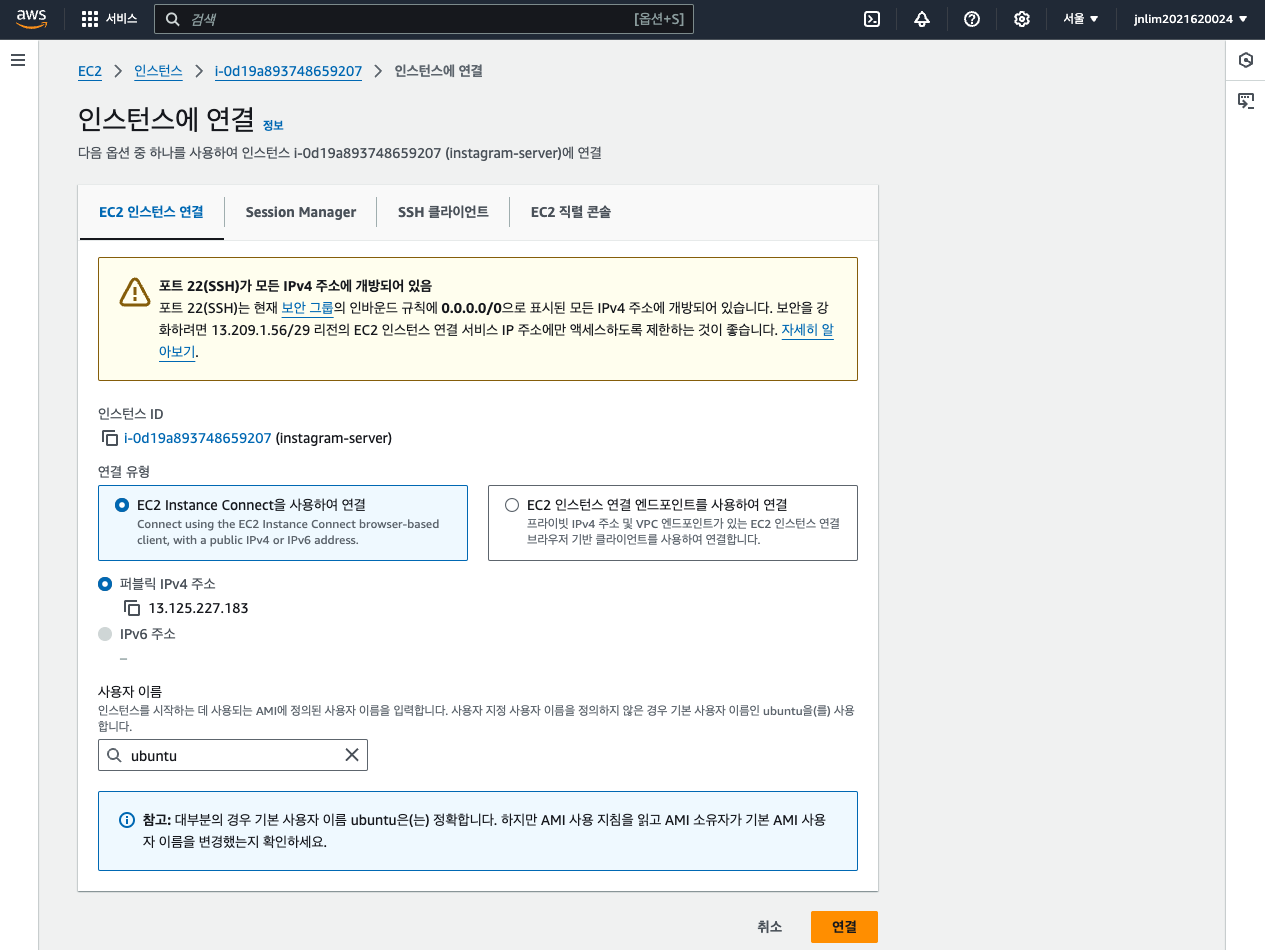 연결을 누르면 EC2 인스턴스에 원격 접속을 하게 된다.