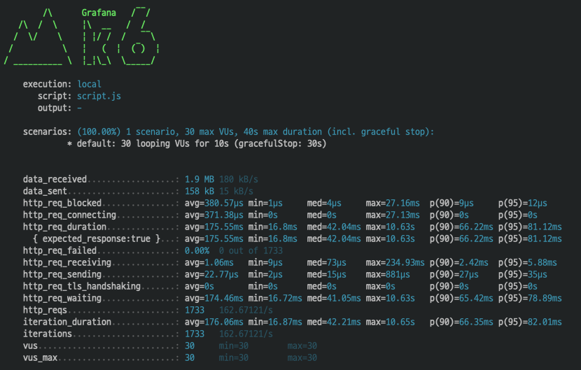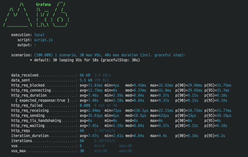 k6 run --vus 30 --duration 10s script.js