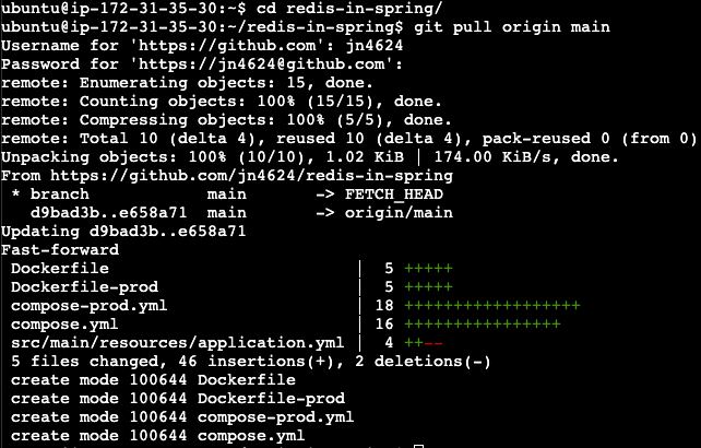 push한 설정 파일들을 EC2에 내려 받아 적용해야 하기 때문에 인스턴스에 접속해서 변경 사항을 Pull 받는다.