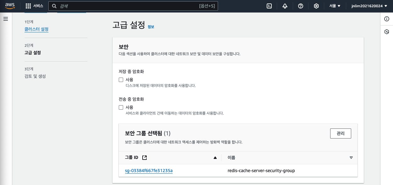 다시 ElastiCache로 돌아와서 위에 생성한 보안 그룹을 선택해준다.