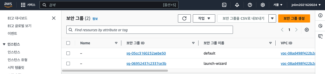 오른쪽 상단에 있는 보안 그룹 생성을 클릭한다.